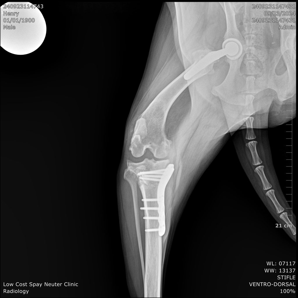 Cranial Cruciate Ligament; (CCL) is one of the most important stabilizers of the knee. It prevents hyperextension, limits internal rotation, and prevents the tibia (shin bone) from sliding forward each time the leg bears weight. When the CCL is damaged, the result is an unstable knee. This instability results in pain and inflammation. Over time, debilitating arthritis develops. Rupture of the cranial cruciate ligament (CCL) of the stifle joint (=knee) is one of the most common orthopedic injury in dogs. It may happen acutely as the result of a true traumatic injury or slow deterioration of the ligament as a dog ages.