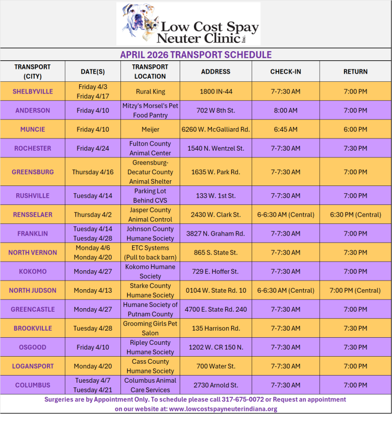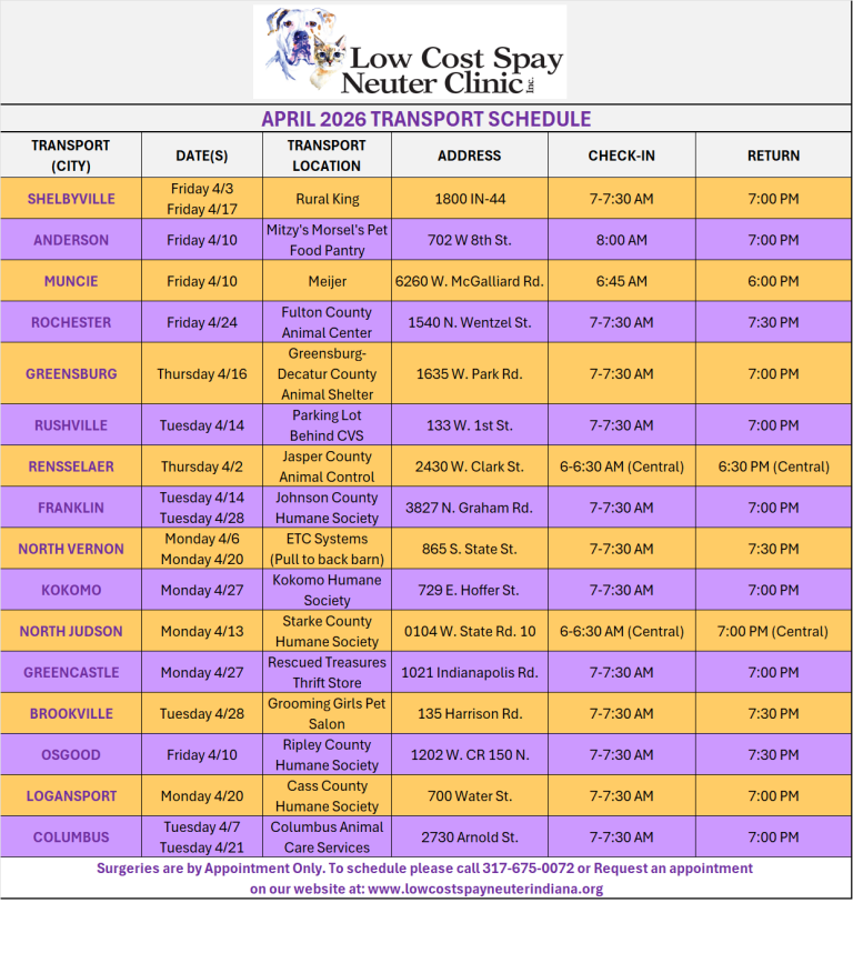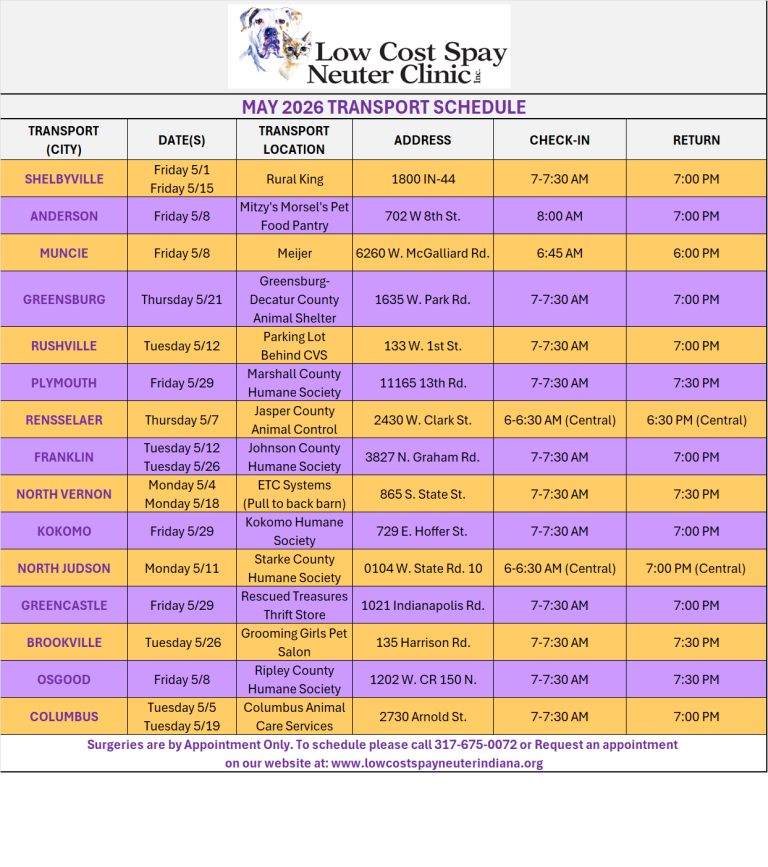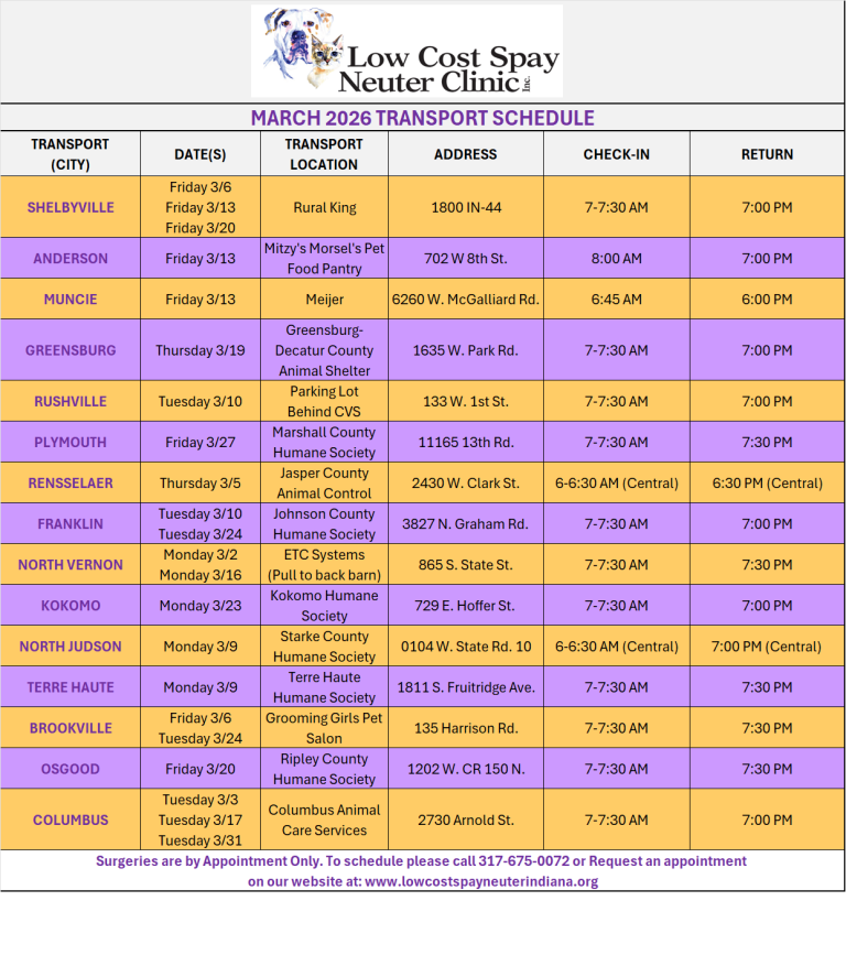The counties we currently transport to are: Bartholomew, Cass, Shelby, Johnson, Jennings, Madison, Delaware, Brown (Shelter Only), Howard, Starke, Jasper, Hancock (Shelter Only), Fulton, Miami, Marshall, Vigo, Decatur, Rush, Montgomery, Ripley, and Franklin.